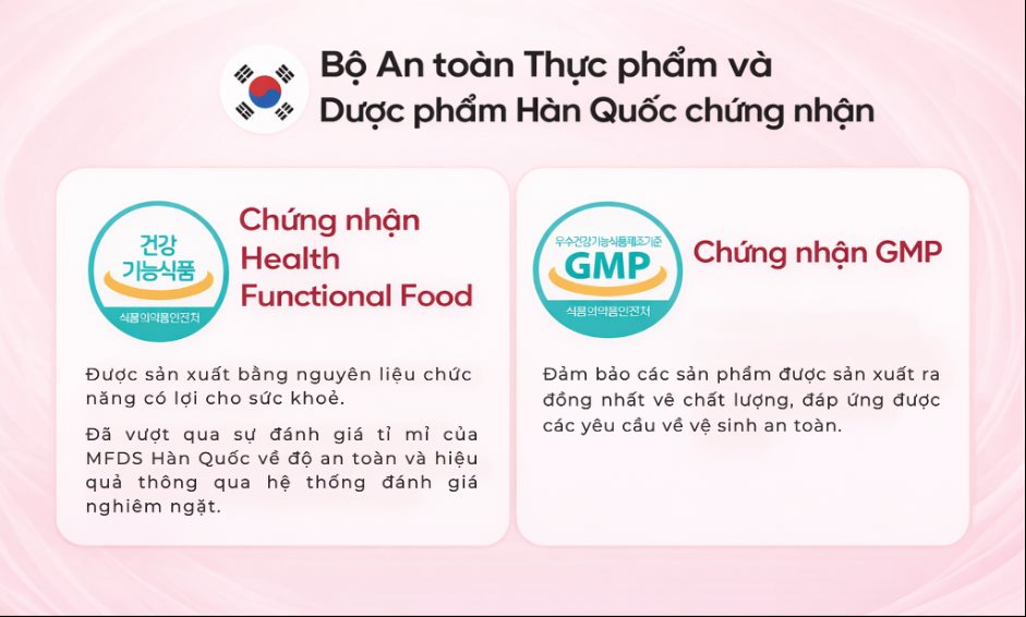 Bên cạnh đó, sản phẩm sở hữu các chứng nhận quan trọng như Health Functional Food và GMP, phản ánh quy trình sản xuất đạt chuẩn, đồng nhất về chất lượng và an toàn vệ sinh.