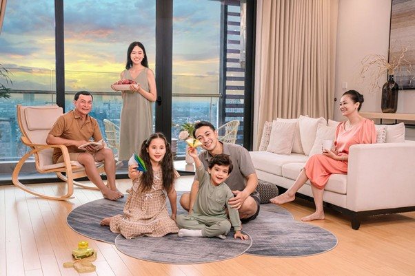 Mỗi căn hộ được tính toán để đảm bảo sự cân bằng giữa không gian riêng tư và khu vực sinh hoạt chung. Với thiết kế mở, khu vực phòng khách và bếp kết nối trực tiếp giúp tối ưu hóa tầm nhìn và sự thông thoáng. Điều này tạo điều kiện thuận lợi cho các gia đình đa thế hệ sinh hoạt cùng nhau, nhưng vẫn duy trì được không gian độc lập cho từng thành viên.
