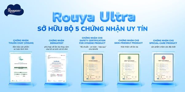 Rouya Ultra tự hào khi sản phẩm đạt hàng loạt chứng nhận uy tín, tiêu biểu là Chứng nhận Thuần Chay (Vegan) - đảm bảo sự lành tính và an toàn cho làn da bé và Chứng nhận Dermatest cấp cao nhất "Excellent" - phù hợp cho cả những làn da nhạy cảm. Ngoài ra sản phẩm còn sở hữu bộ 03 Chứng nhận Tã cấp Y tế - CHS. Đây là minh chứng cho quá trình đảm bảo tiêu chuẩn chất lượng mà Rouya Ultra theo đuổi ngay từ những bước đầu tiên.