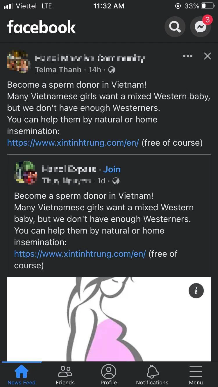 Hàng trăm lời rao cho tinh trùng tràn lan, thậm chí được chia sẻ trong các hội nhóm cộng đồng người nước ngoài tại Việt Nam. Tuy nhiên, cũng từ đây, "niềm hạnh phúc thiêng liêng khi có con" lại trở thành nơi "chế nhạo" thiên chức làm mẹ của người phụ nữ Việt Nam.